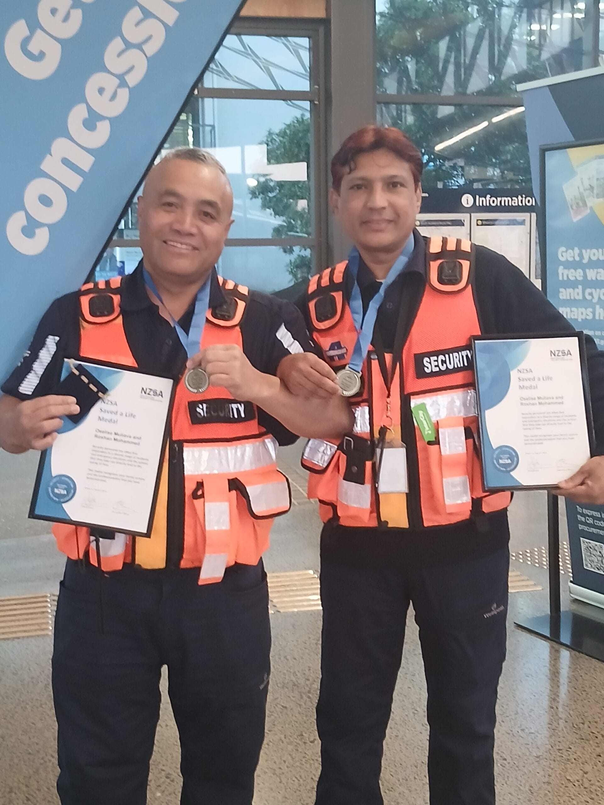Two of our Auckland Transport guards recently showed incredible bravery when they intervened to save a young man’s life while he was being attacked by armed assailants — an act for which they were awarded the NZSA Saved a Life Medal.